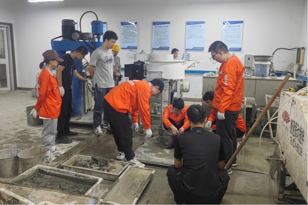 2023年7月開始,長安大學(xué)團(tuán)隊(duì)制定了詳細(xì)的試驗(yàn)研究方案,并在德通公司針對混沌攪拌、真空攪拌等科研內(nèi)容開展了一系列混凝土性能測試試驗(yàn)和數(shù)據(jù)處理等工作。在導(dǎo)師與企業(yè)技術(shù)人員的現(xiàn)場指導(dǎo)下,研究生通過解決機(jī)器突發(fā)故障、應(yīng)對高溫惡劣環(huán)境和調(diào)整混凝土配比不合適等問題,在實(shí)踐中提升了處理實(shí)際難題的能力,同時(shí)通過理論與實(shí)踐緊密結(jié)合,提升了團(tuán)隊(duì)協(xié)作能力和科研能力。