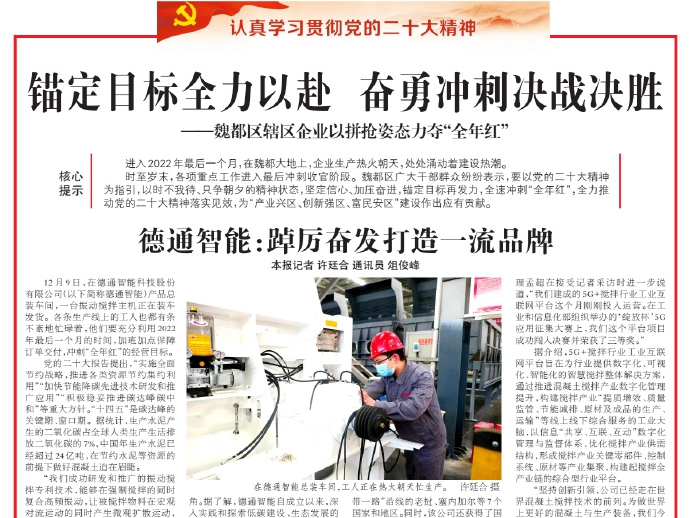 12月9日,在德通智能科技股份有限公司(以下簡稱德通智能)產(chǎn)品總裝車間,一臺振動(dòng)攪拌主機(jī)正在裝車發(fā)貨。